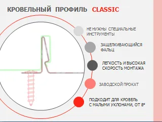 Компания RUUKKI производит фальцевую кровлю, имеющую классическую прямолинейную форму со скрытым видом крепления. Благодаря самозащелкивающемуся креплению, листы фальцевой кровли стыкуются между собой надежно и герметично. Этот вид кровельного материала как нельзя лучше подходит для реставрации исторических сооружений и зданий, имеющих архитектурную ценность, а также успешно используется при проведении кровельных работ на объектах, имеющих небольшой угол уклона крыши (в частности 1:7). Для примерного сравнения: при использовании металлочерепицы в качестве кровельного материала, уклон должен составлять как минимум 1:4. Также, большой популярностью фальцевая кровля пользуется при новом строительстве, где дизайн дома выполнен в классическом стиле.