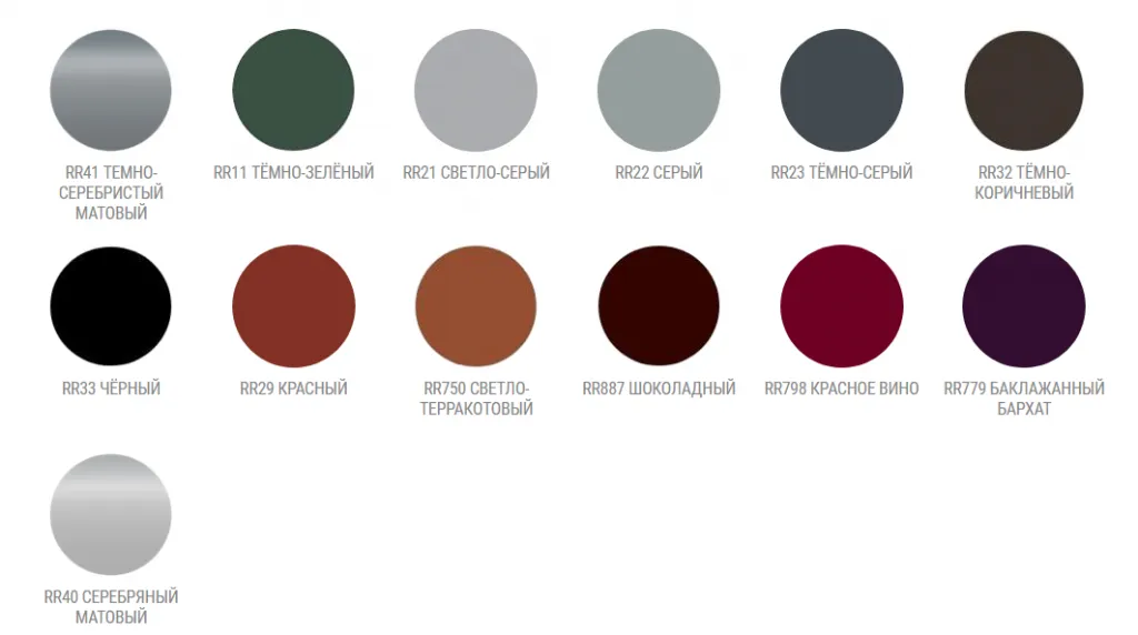 Ваиранты полимерных покрытий GreenCoat: Polyester (Полиэстер), Polyester Matt Rought (Полиэстер Матовый), Crown BT (Purex Пурекс), Pural Matt BT (Пурал Матовый), Hiarc Matt