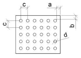 Симметричная перфорация: полностью перфорированная в симметричной квадратной компоновке. Размер (d) и расстояние (a, b, c) одного отверстия на продукт.