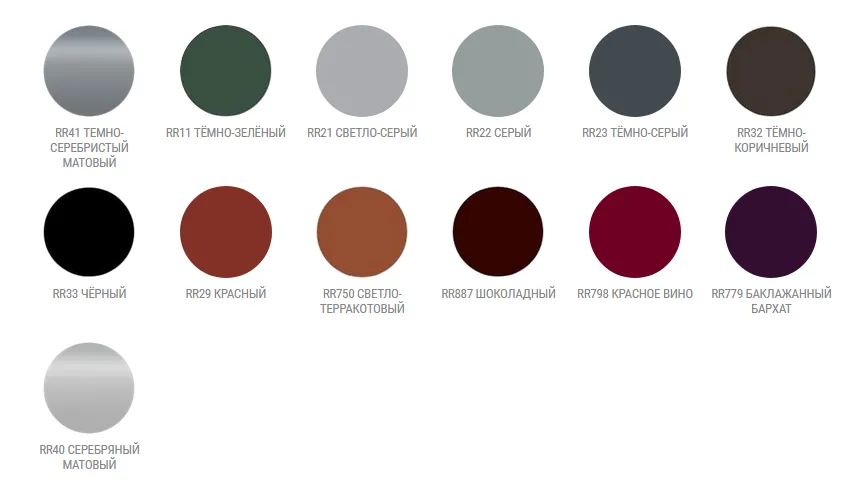 Варианты полимерных покрытий GreenCoat: Polyester (Полиэстер), Polyester Matt Rought (Полиэстер Матовый), Crown BT (Purex Пурекс), Pural Matt BT (Пурал Матовый), Hiarc Matt