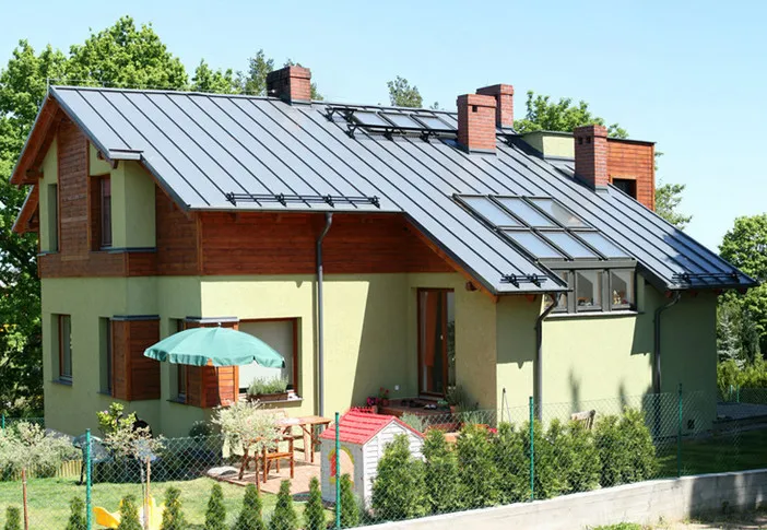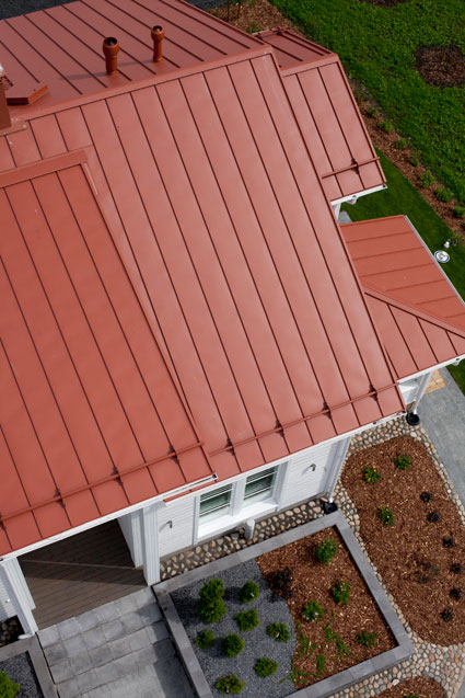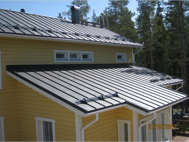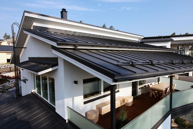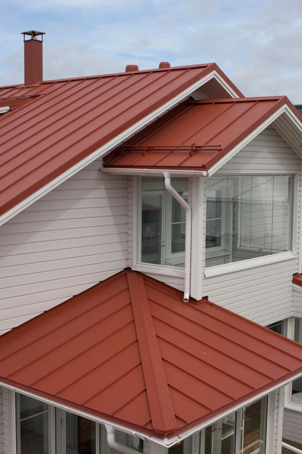 Компания RUUKKI производит фальцевую кровлю, имеющую классическую прямолинейную форму со скрытым видом крепления. Благодаря самозащелкивающемуся креплению, листы фальцевой кровли стыкуются между собой надежно и герметично. Этот вид кровельного материала как нельзя лучше подходит для реставрации исторических сооружений и зданий, имеющих архитектурную ценность, а также успешно используется при проведении кровельных работ на объектах, имеющих небольшой угол уклона крыши (в частности 1:7). Для примерного сравнения: при использовании металлочерепицы в качестве кровельного материала, уклон должен составлять как минимум 1:4. Также, большой популярностью фальцевая кровля пользуется при новом строительстве, где дизайн дома выполнен в классическом стиле.
